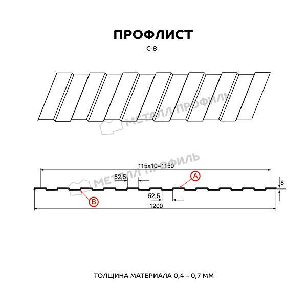 С-8 – наименее рельефный и весьма недорогой профиль. Его способность выдерживать большие нагрузки сравнительно невелика, поэтому данный профиль не применяется в конструкциях, где необходима повышенная прочность. Чаще всего С-8 используют в качестве стенового облицовочного материала, а также для возведения ограждений и монтажа потолков. Характеризуясь наиболее низким профилем – всего 8 мм – он вместе с тем имеет максимальную полезную ширину – 1150 мм. Чаще всего на изготовление С-8 берётся стальной лист толщиной от 0,4 до 0,7 мм. Такой прочности стали будет достаточно для отделки стен или устройства ограждений в климатических зонах с низкой ветровой нагрузкой. Для временных построек ( туалетов, бытовок, времянок, сараев) в Компании Металл Профиль вы можете купить оцинкованный профнастил толщиной 0,35 мм, чтобы не переплачивать без необходимости.